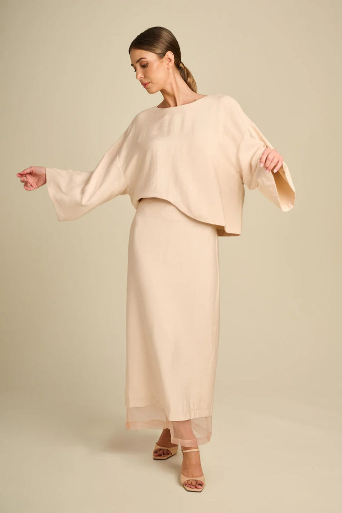 The Delicate blouse is an elegant, feminine piece designed to pair effortlessly with the Luminous skirt or the Spectra skirt for a refined, polished look. Featuring a beautiful deep V-back neckline, it adds a subtle touch of allure, while the half-length sleeves keep the silhouette balanced and sophisticated. Perfect for dressing up or styling with ease for a modern, graceful outfit.
