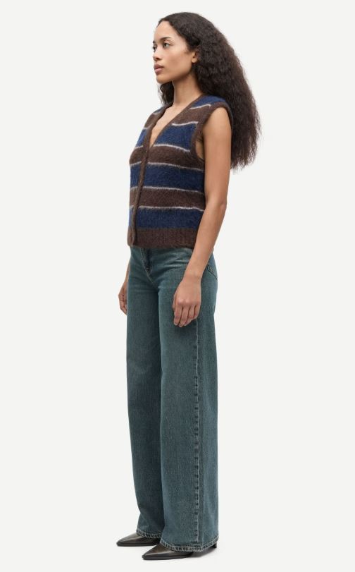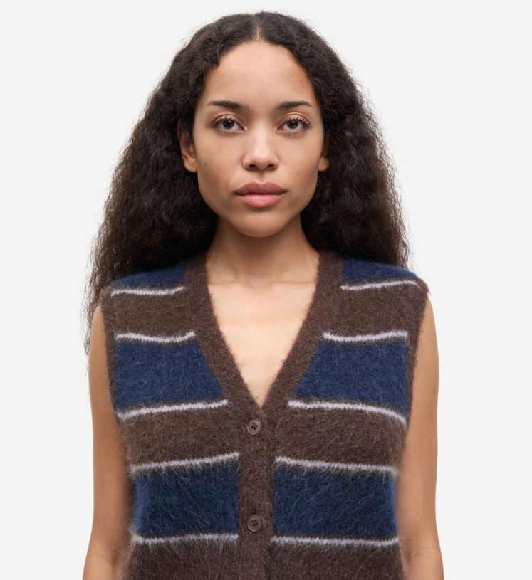 Blue x FrizzanteKnitted vest with a regular fit. Button closure on the front. V-neck. Rib-knitted hem. Embroidered ø branding at the side. Slightly brushed look. Main material made from an elastic blend including alpaca wool.