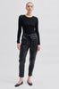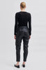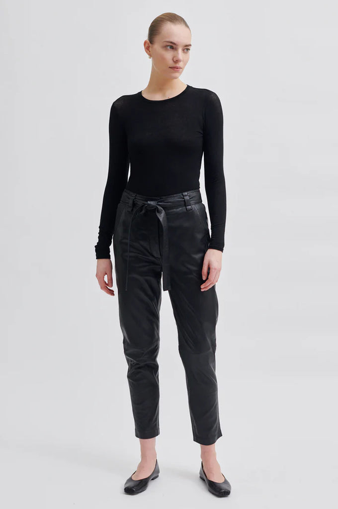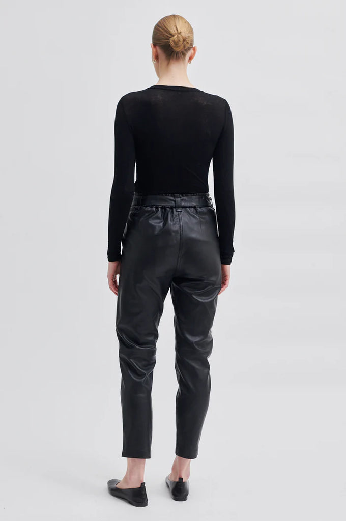 Leather trousers made in a luxurious, soft lamb leather quality. It has wide waistline with belt and elastic at back. The trousers have side pockets and cutline detail at knee. It has mid-rise and straight leg fit.