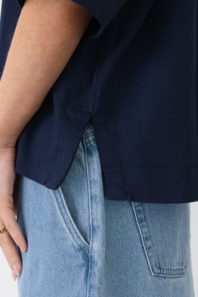 Blue x FrizzanteDesigned with a relaxed fit and subtle side slits for an effortless, laid-back feel. This basic tee is part of our 'Never Out of Style collection'. Made to move with you through every season. Clean lines, minimal details and a timeless silhouette make it an everyday essential you’ll keep coming back to.