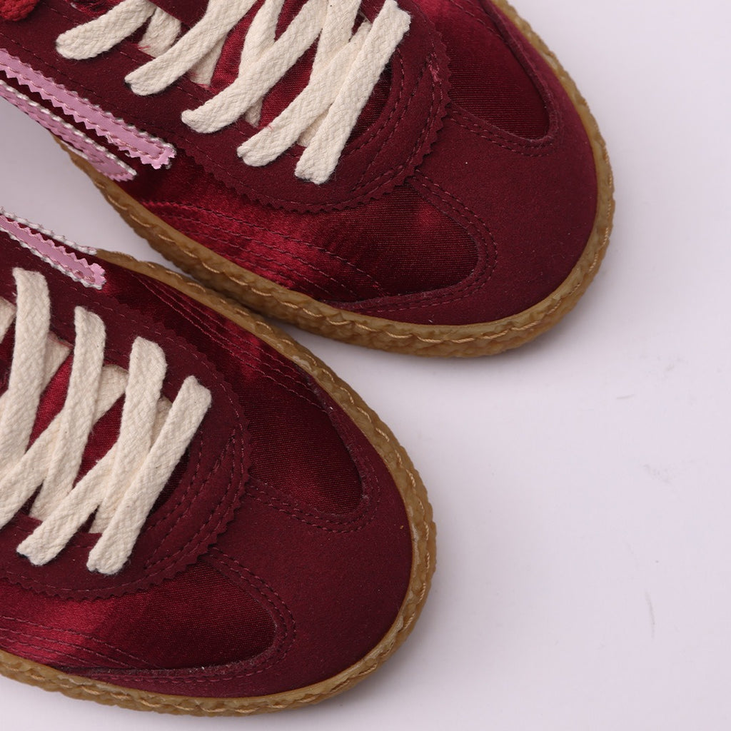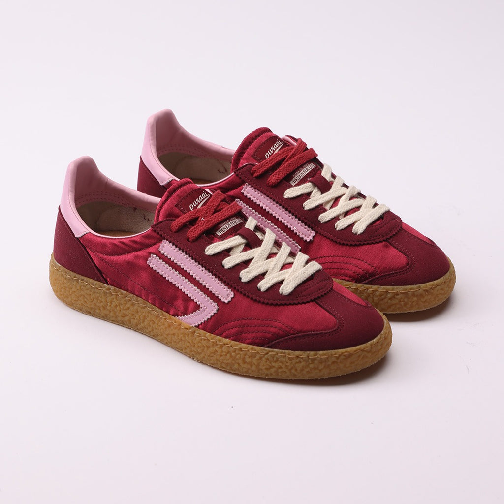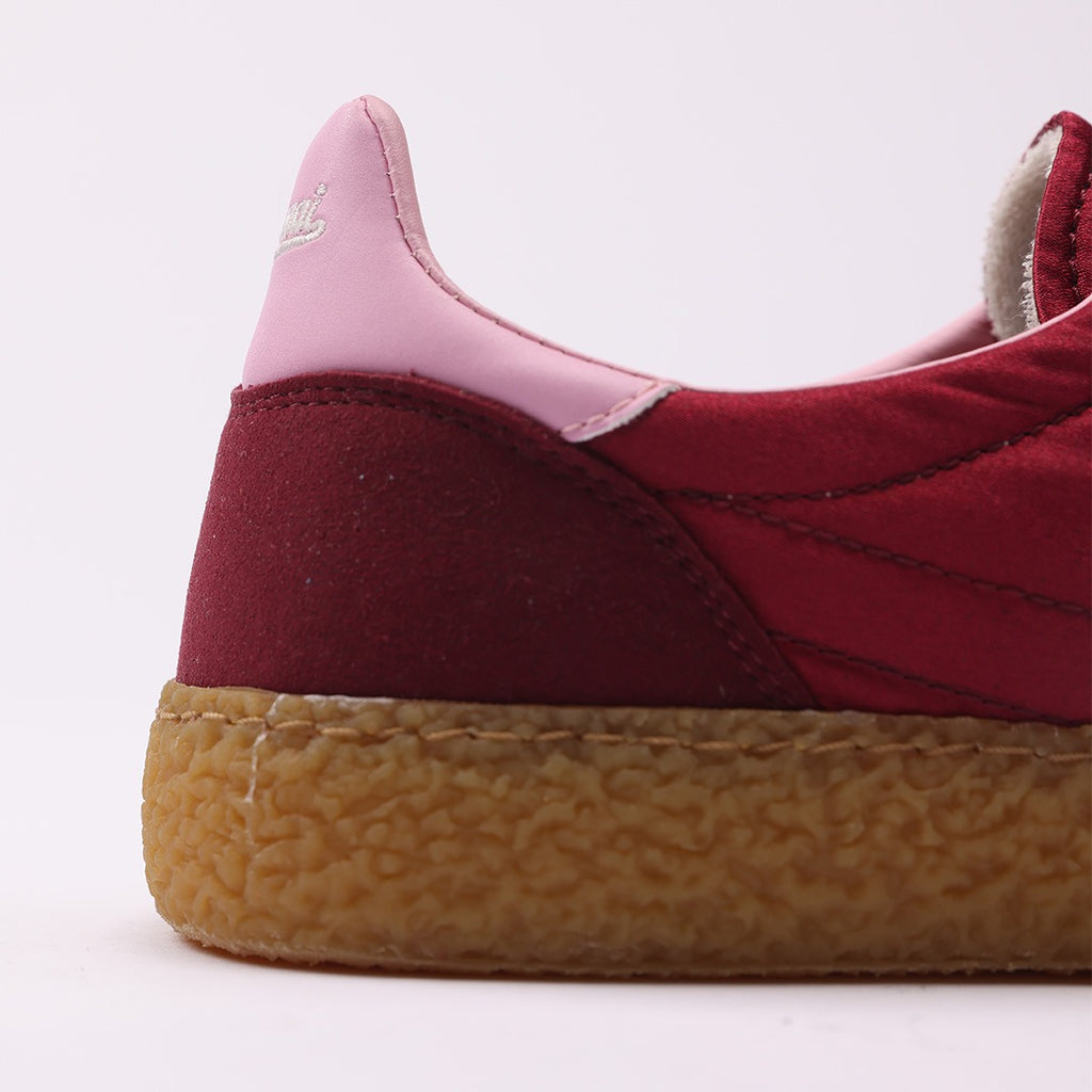 Bordeaux satin and microsuede with pink logo and details. Amber outsole and double bordeaux and ivory laces